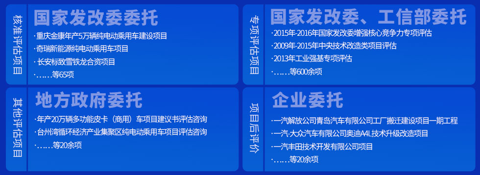 作為汽車行業(yè)承擔(dān)國家發(fā)改委委托投資咨詢?cè)u(píng)估任務(wù)的咨詢機(jī)構(gòu),以開展核準(zhǔn)評(píng)估、專項(xiàng)評(píng)估和后評(píng)價(jià)為核心,多年來致力于為國家、地方重大項(xiàng)目投資決策和企業(yè)投資項(xiàng)目后評(píng)價(jià)提供有力支撐。業(yè)務(wù)方向包含:核準(zhǔn)評(píng)估、專項(xiàng)評(píng)估、其他評(píng)估、項(xiàng)目后評(píng)價(jià)