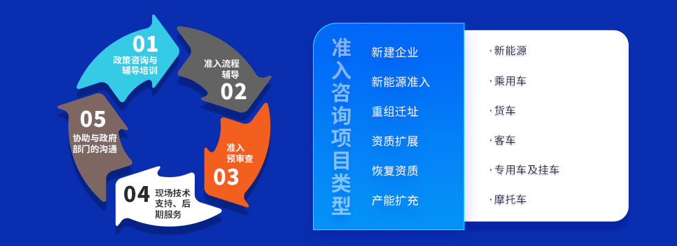 依據(jù)國家發(fā)布的《道路機(jī)動(dòng)車輛生產(chǎn)企業(yè)及產(chǎn)品準(zhǔn)入管理辦法》、《新能源汽車生產(chǎn)企業(yè)及產(chǎn)品準(zhǔn)入管理規(guī)定》等最新政策法規(guī),結(jié)合政策法規(guī)、生產(chǎn)制造、產(chǎn)品開發(fā)、質(zhì)量保證及銷售售后等多方面能力,提供包括傳統(tǒng)車、新能源在內(nèi)的乘用車、貨車、客車、專用車及掛車、摩托車等多種資質(zhì)類別,從項(xiàng)目申報(bào)、前期準(zhǔn)備、細(xì)節(jié)輔導(dǎo)等全過程咨詢服務(wù),助力企業(yè)資質(zhì)提升。
